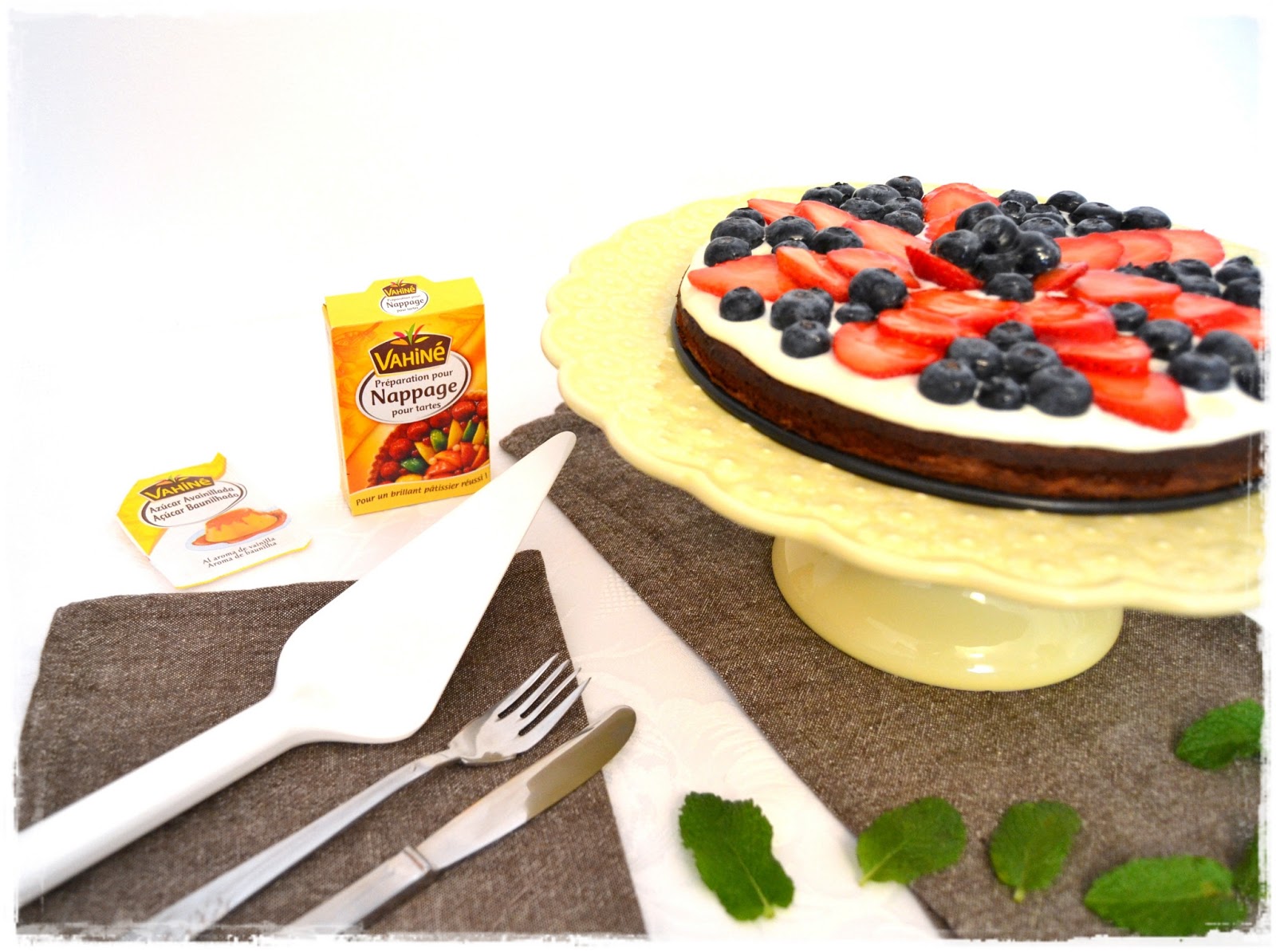 Recentemente, recebi da Vahiné uma embalagem de Nappage para tartes. Para quem não sabe, Nappage é uma cobertura gelatinosa que torna as frutas das tartes mais brilhantes e saborosas. Senti-me desafiado a cozinhar algo com esta cobertura e então decidi fazer esta tarte, em que a base é totalmente Brownie e a cobertura é de creme de queijo. Optei por usar morangos e mirtilos. Os morangos porque são a fruta da época e os mirtilos porque adoro.