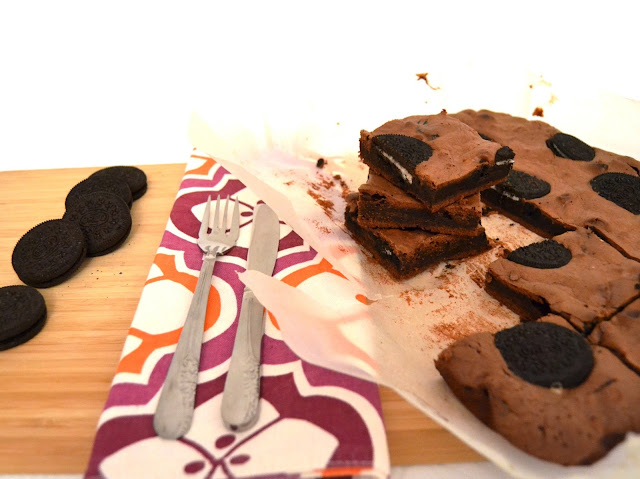 Há algum tempo que andava para experimentar algo deste género. A receita original é da Lorraine Pascal, (ver vídeo aqui) mas foi quando o Diogo, autor do blog "A Culpa é das Bolachas", publicou a receita de Brownies de Oreo que eu disse para mim mesmo "é hoje". E foi! E ainda bem porque estes brownies são assim uma coisa tão maravilhosa que certamente os irei repetir mais vezes. O interior sabe intensamente a chocolate e fica húmido a contrastar com o crocante dos oreos que ficam no exterior.