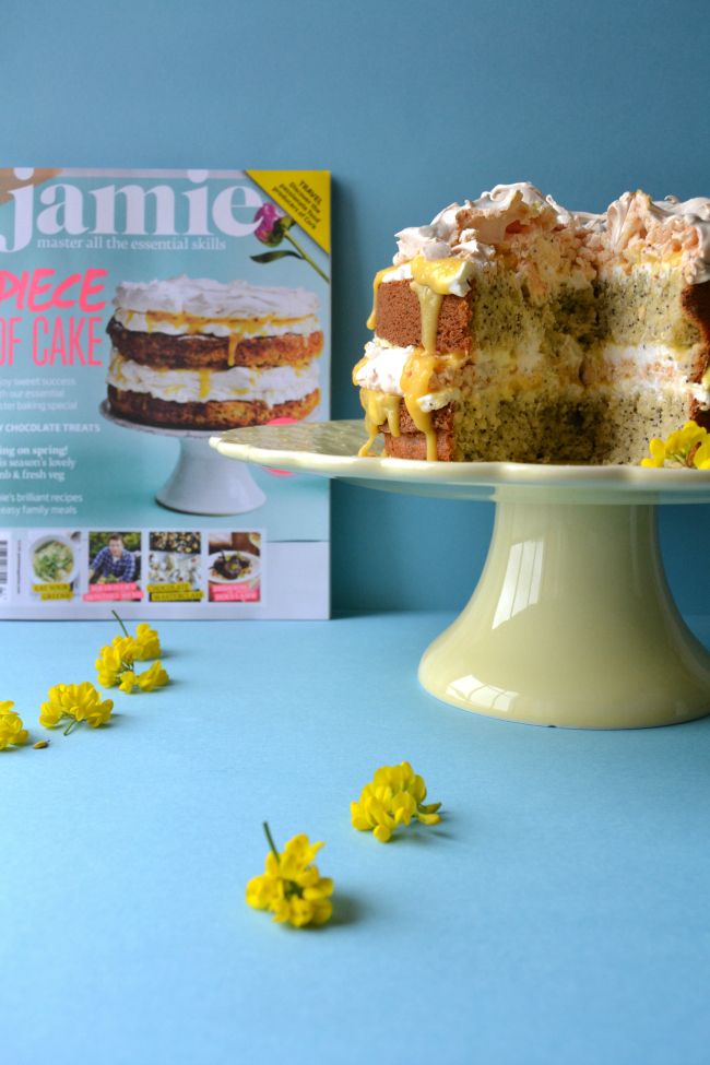 Mas o post já vai longo e como se aperceberam eu trago uma receita para assinalar este 1º ano de blog. Inicialmente pensei em fazer um Naked Cake de frutos vermelhos, gosto deste género de bolos e adoro frutos vermelhos. Mas mais uma vez o senhor Jamie (sim, outra vez o Jamie!) trocou-me as voltas e levou-me antes a fazer este Lemon & Poppy Seed Meringue Layer Cake. O bolo faz parte da capa da Jamie Magazine #47 e assim que recebi a revista no correio, eu soube imediatamente que tinha de fazer este bolo. E esta foi a ocasião perfeita! O sabor do bolo é divinal, a frescura ácida do limão contrasta na perfeição com o crocante do merengue e das sementes de papoila num bolo fofo e decadente.