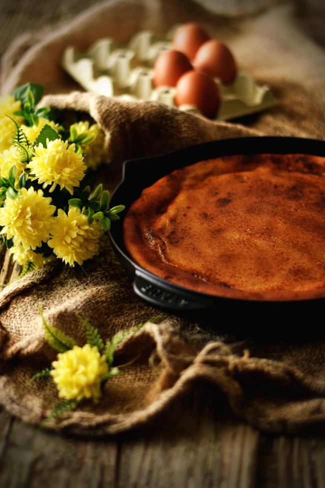 Foi assim que "tropecei" na receita da tigelada de requeijão. Sempre gostei de tigeladas, as tradicionais, feitas com leite, açúcar e ovos. Mas quando encontrei esta de requeijão, um ingrediente que adoro e não dispenso na minha cozinha, fiquei com imensa vontade de a experimentar. Esta tigelada, também designada como Requeijão no Forno, é um doce típico da região de Idanha-a-Nova, no distrito de Castelo Branco. Neste doce não é usado leite, sendo o ingrediente de referência o requeijão, o que a torna mais densa e húmida que a tigelada tradicional. As tigeladas normalmente vão ao forno num prato ou tigela de barro, as caçoilas, que são feitos à mão e apresentam um vidrado. Como eu não tenho uma caçoila em casa e não aguentei esperar para fazer a receita, usei a minha frigideira em ferro fundido da Staub, que podem encontrar à venda aqui.