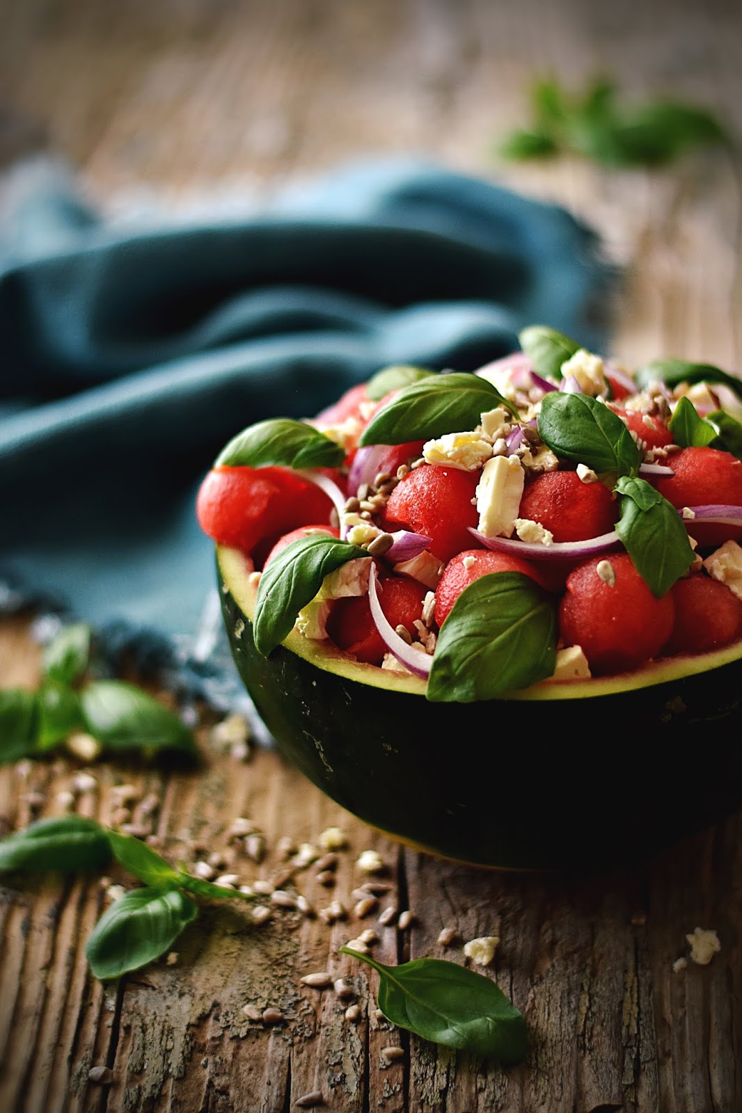 3 . Transfira a salada para dentro da casca da melancia (opcional) e sirva com sementes de girassol e folhas de manjericão.