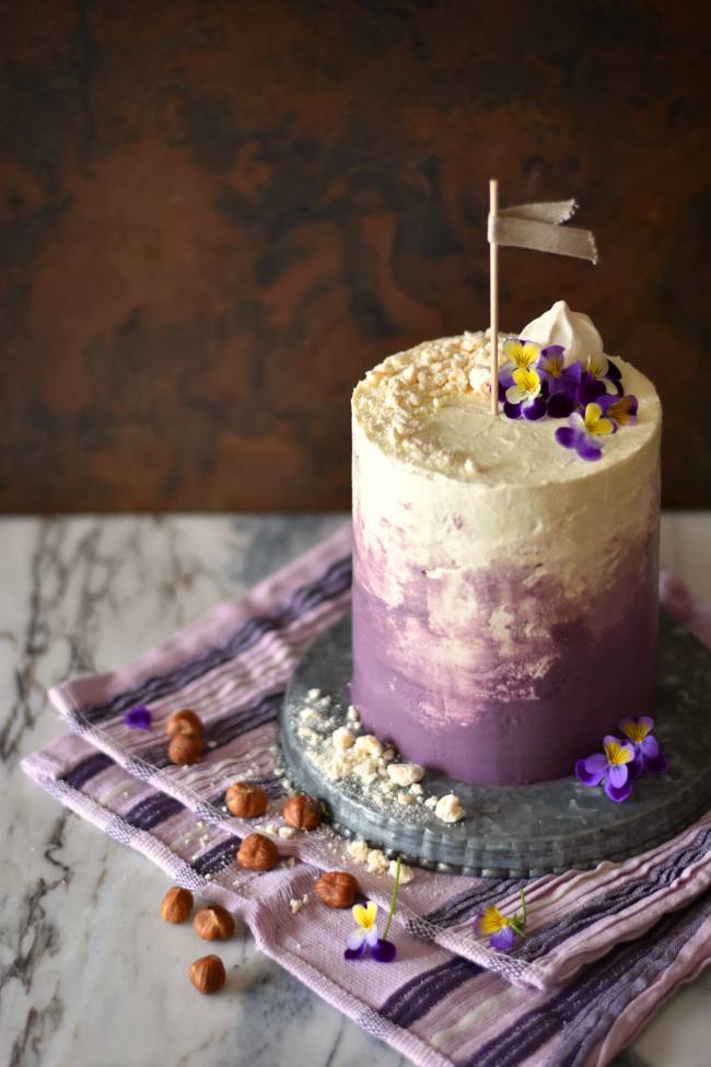 Na parte mais baixa do bolo adicione buttercream de cor violeta e vá alisando até obter o efeito desejado.