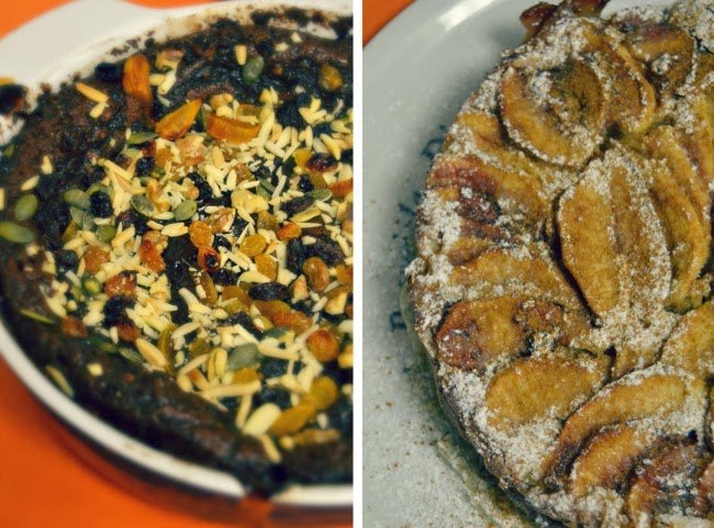 As deliciosas sobremesas, o Cobbler de Chocolate com Frutos Secos e o Clafoutis de Maçã.