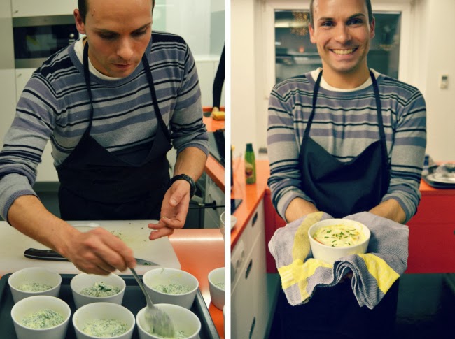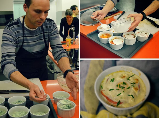 As receitas foram sorteadas e calhou-nos para fazer os Ovos Gratinados com Ricotta, Espinafres e Tomate que foram servidos como entrada. Modéstia à parte, acho que correu lindamente, atendendo aos elogios de todos os participantes e à rapidez com que foram devorados. A receita é muito boa, de fácil execução e irei partilhá-la num próximo post.